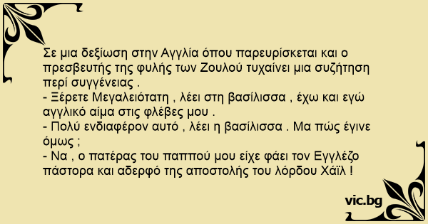 Σε μια δεξίωση στην Αγγλία όπου παρευρίσκεται και ο πρεσβευτής της φυλής των Ζουλού τυχαίνει μια συζήτηση περί συγγένειας .