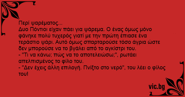 Δυο Πόντιοι είχαν πάει για ψάρεμα. Ο ένας όμως μόνο φάνηκε πολύ τυχερός γιατί με την πρώτη έπιασε ένα τεράστιο ψάρι. Αυτό όμως σπαρταρούσε τόσο άγρια ώστε δεν μπορούσε να το βγάλει από το αγκίστρι του.