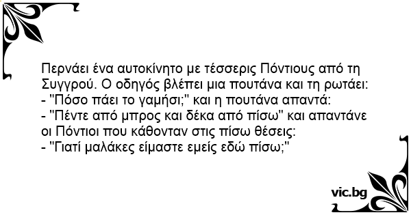 Περνάει ένα αυτοκίνητο με τέσσερις Πόντιους από τη Συγγρού. Ο οδηγός βλέπει μια πουτάνα και τη ρωτάει: