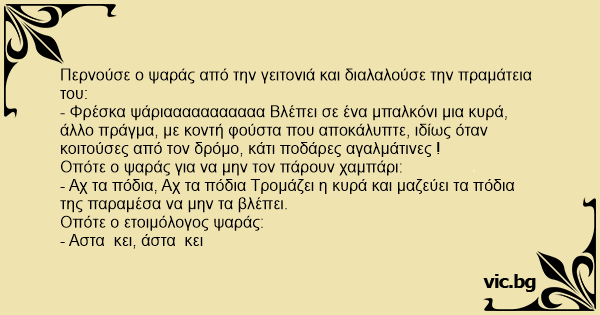 - Φρέσκα ψάριααααααααααα Βλέπει σε ένα μπαλκόνι μια κυρά, άλλο πράγμα, με κοντή φούστα που αποκάλυπτε, ιδίως όταν κοιτούσες από τον δρόμο, κάτι ποδάρες αγαλμάτινες !