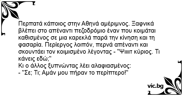 Περπατά κάποιος στην Αθηνά αμέριμνος. Ξαφνικά βλέπει στο απέναντι πεζοδρόμιο έναν που κοιμάται καθισμένος σε μια καρεκλά παρά την κίνηση και τη φασαρία. Περίεργος λοιπόν, περνά απέναντι και σκουντάει τον κοιμισμένο λέγοντας - "Ψιιιιτ κύριος. Τι κάνεις εδώ;"