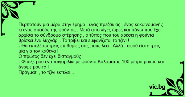 - Θα εκτελέσω τρεις επιθυμίες σας ,τους λέει . Αλλά , αφού είστε τρεις μία για τον καθένα !