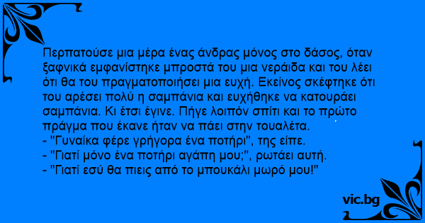 Περπατούσε μια μέρα ένας άνδρας μόνος στο δάσος, όταν ξαφνικά εμφανίστηκε μπροστά του μια νεράιδα και του λέει ότι θα του πραγματοποιήσει μια ευχή. Εκείνος σκέφτηκε ότι του αρέσει πολύ η σαμπάνια και ευχήθηκε να κατουράει σαμπάνια. Κι έτσι έγινε. Πήγε λοιπόν σπίτι και το πρώτο πράγμα που έκανε ήταν να πάει στην τουαλέτα.