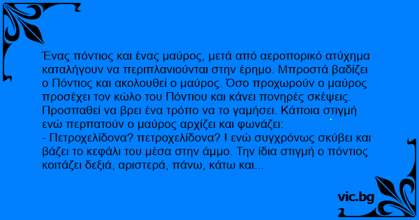 - Πετροχελίδονα? πετροχελίδονα? ! ενώ συγχρόνως σκύβει και βάζει το κεφάλι του μέσα στην άμμο. Την ίδια στιγμή ο πόντιος κοιτάζει δεξιά, αριστερά, πάνω, κάτω και προσπαθεί να καταλάβει τι γίνεται. Ο μαύρος σηκώνεται μετά από λίγο, βλέπει τον Πόντιο και τον ρωτά γεμάτος αγωνία: