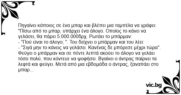 "Πίσω από το μπαρ, υπάρχει ένα άλογο. Οποίος το κάνει να γελάσει, θα πάρει 5.000.000δρχ. Ρωτάει το μπάρμαν: