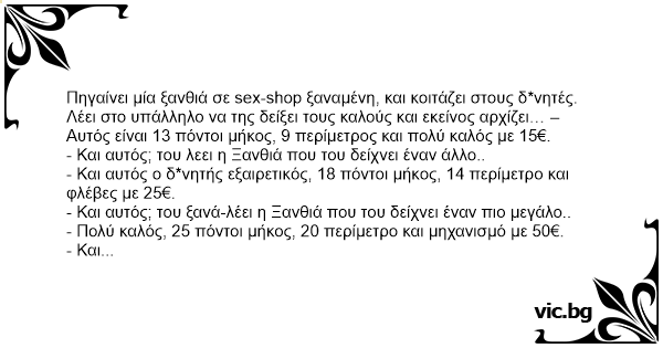 Ateina blondine i erotine prekiu parduotuve ir klause pardavejos .. sakykit po kiek pas jus vibratoriai.? PARDAVEJE : 100lt 120lt 150lt BLONDINE: sakykit o tas dydelis raudonas po kiek?...