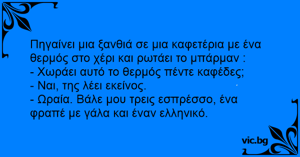 - Ωραία. Βάλε μου τρεις εσπρέσσο, ένα φραπέ με γάλα και έναν ελληνικό.