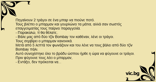 - Εντάξει, δεν πρόκειται να σχολιάσω το γεγονός ότι είστε δύο τράγοι που πίνετε στο μπαρ μου, αλλά η απορία μου είναι γιατί παραγγέλνατε από δύο Bombay κάθε φορά;