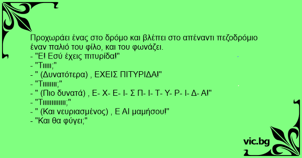 Προχωράει ένας στο δρόμο και βλέπει στο απέναντι πεζοδρόμιο έναν παλιό του φίλο, και του φωνάζει.