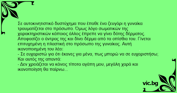 Σε αυτοκινητιστικό δυστύχημα που έπαθε ένα ζευγάρι η γυναίκα τραυματίζεται στο πρόσωπο. Όμως λόγο σωματικών της χαρακτηριστικών κάποιος άλλος έπρεπε να γίνει δότης δέρματος. Αποφασίζει ο άντρας της και δίνει δέρμα από τα οπίσθια του. Γίνεται επιτυχημένη η πλαστική στο πρόσωπο της γυναίκας. Αυτή ικανοποιημένη του λέει: