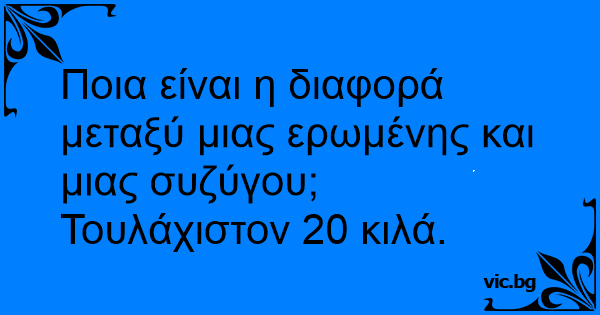 - Яка різниця між дружиною і коханкою? - Кілограмів двадцять ... - А яка різниця між чоловіком і коханцем? - Хвилин 30 ...