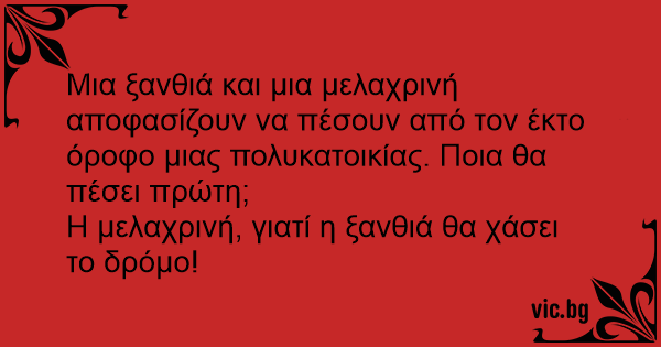 Μια ξανθιά και μια μελαχρινή αποφασίζουν να πέσουν από τον έκτο όροφο μιας πολυκατοικίας. Ποια θα πέσει πρώτη;