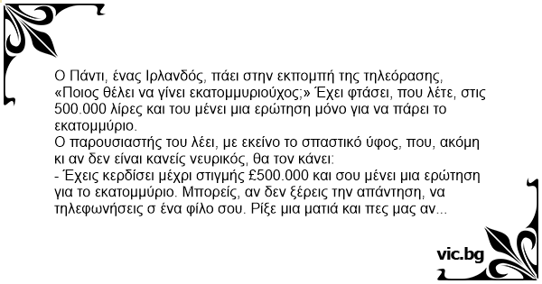 Ο Πάντι, ένας Ιρλανδός, πάει στην εκπομπή της τηλεόρασης, «Ποιος θέλει να γίνει εκατομμυριούχος;» Έχει φτάσει, που λέτε, στις 500.000 λίρες και του μένει μια ερώτηση μόνο για να πάρει το εκατομμύριο.