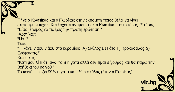 "Κάτι μου λέει ότι είναι το Β η γάτα αλλά δεν είμαι σίγουρος και θα πάρω την βοήθεια του κοινού."