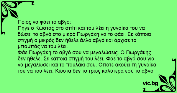 Φάε Γιωργάκη το αβγό σου να μεγαλώσεις. Ο Γιωργάκης δεν ήθελε. Σε κάποια στιγμή του λέει. Φάε το αβγό σου για να μεγαλώσει και το πουλάκι σου. Οπότε ακούει τη γυναίκα του να του λέει. Κώστα δεν το τρως καλύτερα εσύ το αβγό;
