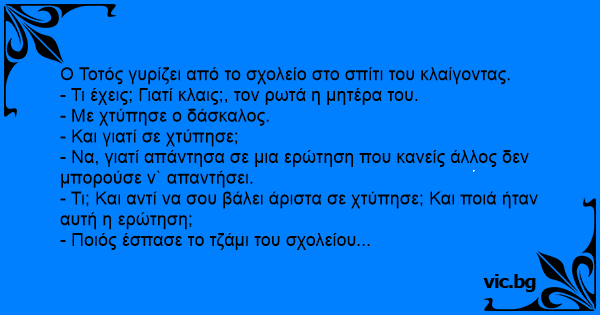 - Τι; Και αντί να σου βάλει άριστα σε χτύπησε; Και ποιά ήταν αυτή η ερώτηση;