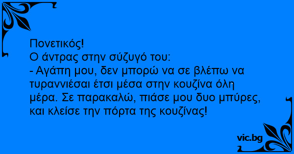- Αγάπη μου, δεν μπορώ να σε βλέπω να τυραννιέσαι έτσι μέσα στην κουζίνα όλη μέρα. Σε παρακαλώ, πιάσε μου δυο μπύρες, και κλείσε την πόρτα της κουζίνας!