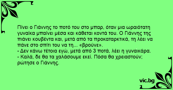 Πίνει ο Γιάννης το ποτό του στο μπαρ, όταν μια ωραιότατη γυναίκα μπαίνει μέσα και κάθεται κοντά του. Ο Γιάννης της πιάνει κουβέντα και, μετά από τα προκαταρκτικά, τη λέει να πάνε στο σπίτι του να τη... «βρούνε».