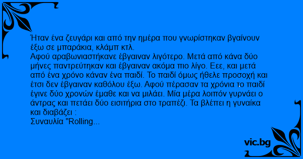 Αφού αραβωνιαστήκανε έβγαιναν λιγότερο. Μετά από κάνα δύο μήνες παντρεύτηκαν και έβγαιναν ακόμα πιο λίγο. Εεε, και μετά από ένα χρόνο κάναν ένα παιδί. Το παιδί όμως ήθελε προσοχή και έτσι δεν έβγαιναν καθόλου έξω. Αφού πέρασαν τα χρόνια το παιδί έγινε δύο χρονών έμαθε και να μιλάει. Μία μέρα λοιπόν γυρνάει ο άντρας και πετάει δύο εισιτήρια στο τραπέζι. Τα βλέπει η γυναίκα και διαβάζει :