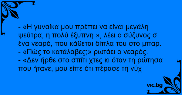 - «Η γυναίκα μου πρέπει να είναι μεγάλη ψεύτρα, η πολύ έξυπνη », λέει ο σύζυγος σ ένα νεαρό, που κάθεται δίπλα του στο μπαρ.