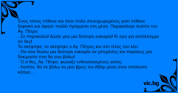 Ένας τύπος πέθανε και ήταν πολύ στεναχωρημένος γιατί πέθανε ξαφνικά και άφησε πολλά πράγματα στη μέση. Παρακάλαγε λοιπόν τον Αγ. Πέτρο: