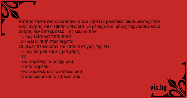 Κάποτε έπεσε ένα αεροπλάνο σ ένα νησί και μοναδικοί διασωθέντες ήταν ένας άντρας και η Cindy Crawford. Οι μέρες και οι μήνες περνούσαν και ο άντρας δεν άντεχε άλλο. Της λέει λοιπόν:
