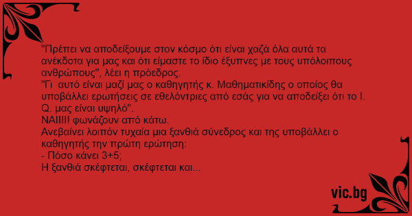 "Πρέπει να αποδείξουμε στον κόσμο ότι είναι χαζά όλα αυτά τα ανέκδοτα για μας και ότι είμαστε το ίδιο έξυπνες με τους υπόλοιπους ανθρώπους", λέει η πρόεδρος. "Γι αυτό είναι μαζί μας ο καθηγητής κ. Μαθηματικίδης ο οποίος θα υποβάλλει ερωτήσεις σε εθελόντριες από εσάς για να αποδείξει ότι το Ι. Q. μας είναι υψηλό". ΝΑΙΙΙΙ! φωνάζουν από κάτω. Ανεβαίνει λοιπόν τυχαία μια ξανθιά σύνεδρος και της υποβάλλει ο καθηγητής την πρώτη ερώτηση: - Πόσο κάνει 3+5; Η ξανθιά σκέφτεται, σκέφτεται και λέει: "6"; Το κοινό από κάτω: "Δωστησ κι αλλη ευκαιρια! Δωστησ κι αλλη ευκαιρια!" - Καλά (λέει ο καθηγητής) ίσως να είχε λίγο τρακ. Ας ξαναδοκιμάσουμε. Πόσο κάνει 7+3; Η ξανθιά σκέφτεται πάλι, ξανασκέφτεται και λέει δειλά: "5"; Το κοινό από κάτω: "Δωστησ κι αλλη ευκαιρια! Δωστησ κι αλλη ευκαιρια!" - Εντάξει, λέει ο καθηγητής, θα κάνω μια πιο απλή ερώτηση τώρα. Πόσο κάνει 1+1; Η ξανθιά σκέφτεται, σκέφτεται, ζορίζεται, κοκκινίζει και λέει: "2"; Το κοινό από κάτω: "Δωστησ κι αλλη ευκαιρια! Δωστησ κι αλλη ευκαιρια!"