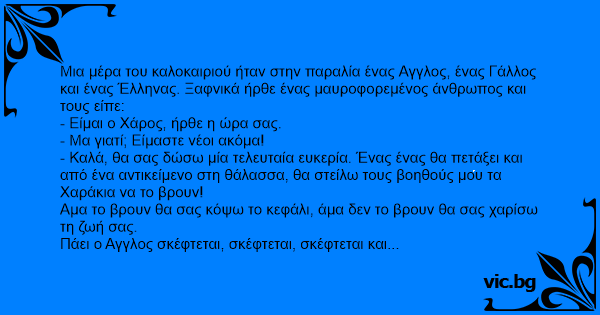 Μια μέρα του καλοκαιριού ήταν στην παραλία ένας Αγγλος, ένας Γάλλος και ένας Έλληνας. Ξαφνικά ήρθε ένας μαυροφορεμένος άνθρωπος και τους είπε: