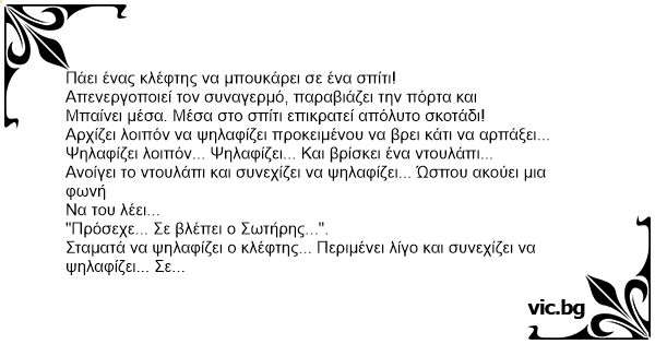 Μπαίνει ένας κλέφτης νύχτα σε ένα σπίτι. Αρχίζει με τον φακό να ψάχνει κάτι πολύτιμο. Ξαφνικά ακούει μια φωνή: - Ο Ιησούς σε προσέχει! Ταραγμένος ψάχνει με τον φακό γύρω του αλλά δεν βλέπει τίποτα....