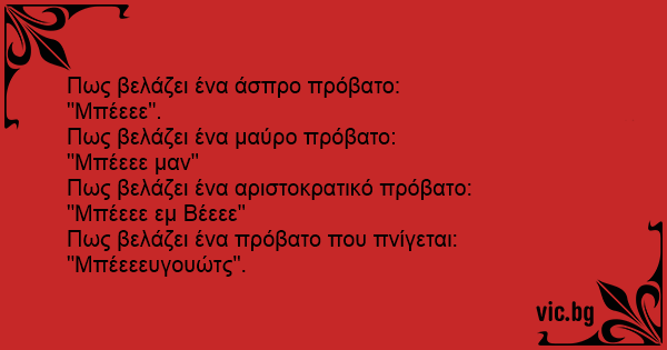 Πως βελάζει ένα άσπρο πρόβατο:<br />"Μπέεεε".<br />Πως βελάζει ένα μαύρο πρόβατο:<br />"Μπέεεε μαν"<br />Πως βελάζει ένα αριστοκρατικό πρόβατο:<br />"Μπέεεε εμ Βέεεε"<br />Πως βελάζει ένα πρόβατο που πνίγεται:<br />"Μπέεεευγουώτς".