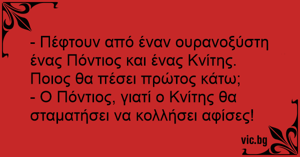 - Πέφτουν από έναν ουρανοξύστη ένας Πόντιος και ένας Κνίτης. Ποιος θα πέσει πρώτος κάτω;