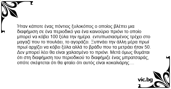 Ήταν κάποτε ένας πόντιος ξυλοκόπος ο οποίος βλέπει μια διαφήμιση σε ένα περιοδικό για ένα καινούριο πριόνι το οποίο μπορεί να κόβει 100 ξύλα την ημέρα. εντυπωσιασμένος τρέχει στο μαγαζί που το πουλάει, το αγοράζει. Ξυπνάει την άλλη μέρα πρωί πρωί αρχίζει να κόβει ξύλα αλλά το βράδυ που τα μετράει ήταν 50.