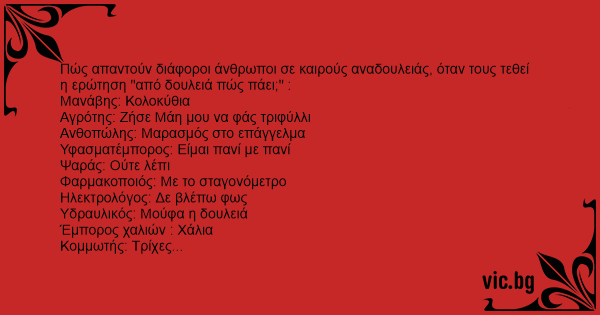 Πώς απαντούν διάφοροι άνθρωποι σε καιρούς αναδουλειάς, όταν τους τεθεί η ερώτηση "από δουλειά πώς πάει;" :
