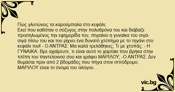 Εκεί που καθόταν ο σύζυγος στην πολυθρόνα του και διάβαζε προσηλωμένος την εφημερίδα του, πηγαίνει η γυναίκα του σιγά-σιγά πίσω του και του ρίχνει ένα δυνατό χτύπημα με το τηγάνι στο κεφάλι του! - Ο ΑΝΤΡΑΣ: Μα καλά τρελάθηκες; Τι με χτυπάς; - Η ΓΥΝΑΙΚΑ: Βρε αχαΐρευτε, τι είναι αυτό το χαρτάκι που βρήκα στην τσέπη του παντελονιού σου και γράφει ΜΑΡΙΛΟΥ; -Ο ΑΝΤΡΑΣ: Δεν θυμάσαι πριν από 2 βδομάδες που πήγα στον ιππόδρομο; ΜΑΡΙΛΟΥ είναι το όνομα του αλόγου που είχα ποντάρει.