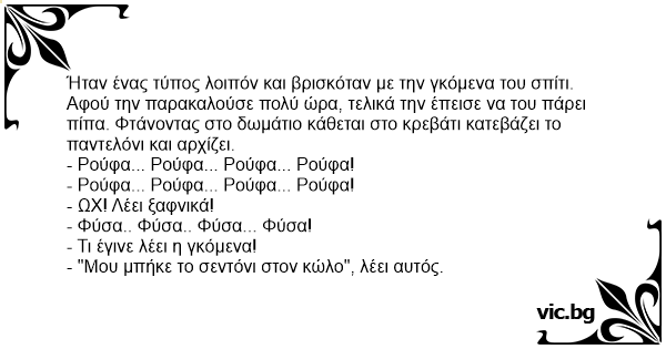 Ήταν ένας τύπος λοιπόν και βρισκόταν με την γκόμενα του σπίτι. Αφού την παρακαλούσε πολύ ώρα, τελικά την έπεισε να του πάρει πίπα. Φτάνοντας στο δωμάτιο κάθεται στο κρεβάτι κατεβάζει το παντελόνι και αρχίζει.
