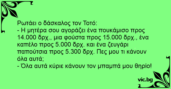 - Η μητέρα σου αγοράζει ένα πουκάμισο προς 14.000 δρχ., μια φούστα προς 15.000 δρχ., ένα καπέλο προς 5.000 δρχ. και ένα ζευγάρι παπούτσια προς 5.300 δρχ. Πες μου τι κάνουν όλα αυτά;