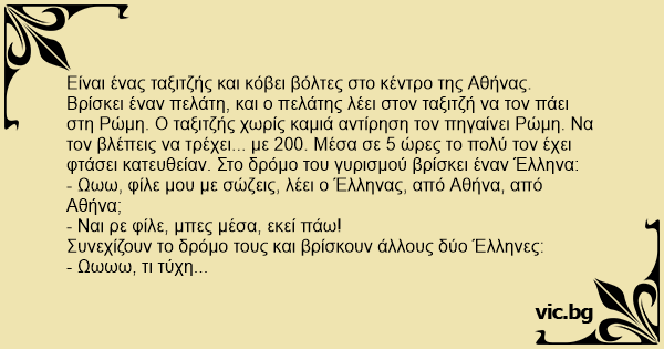 Βρίσκει έναν πελάτη, και ο πελάτης λέει στον ταξιτζή να τον πάει στη Ρώμη. Ο ταξιτζής χωρίς καμιά αντίρηση τον πηγαίνει Ρώμη. Να τον βλέπεις να τρέχει... με 200. Μέσα σε 5 ώρες το πολύ τον έχει φτάσει κατευθείαν. Στο δρόμο του γυρισμού βρίσκει έναν Έλληνα: