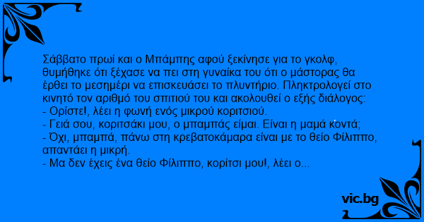 - Όχι, μπαμπά, πάνω στη κρεβατοκάμαρα είναι με το θείο Φίλιππο, απαντάει η μικρή.