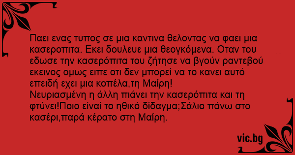 Παει ενας τυπος σε μια καντινα θελοντας να φαει μια κασεροπιτα. Εκει δουλευε μια θεογκόμενα. Οταν του εδωσε την κασερόπιτα του ζήτησε να βγούν ραντεβού εκεινος ομως ειπε οτι δεν μπορεί να το κανει αυτό επειδή εχει μια κοπέλα,τη Μαίρη!