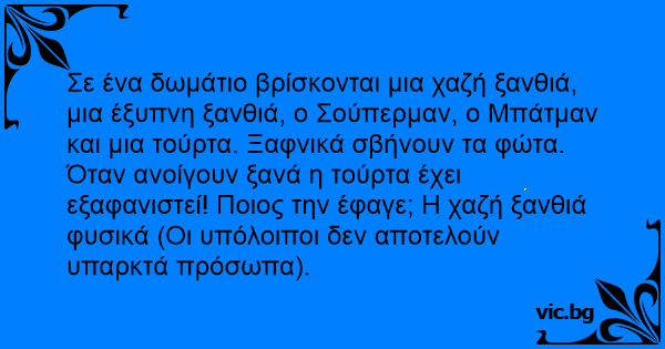 Σε ένα δωμάτιο βρίσκονται μια χαζή ξανθιά, μια έξυπνη ξανθιά, ο Σούπερμαν, ο Μπάτμαν και μια τούρτα. Ξαφνικά σβήνουν τα φώτα. Όταν ανοίγουν ξανά η τούρτα έχει εξαφανιστεί! Ποιος την έφαγε; Η χαζή ξανθιά φυσικά (Οι υπόλοιποι δεν αποτελούν υπαρκτά πρόσωπα).