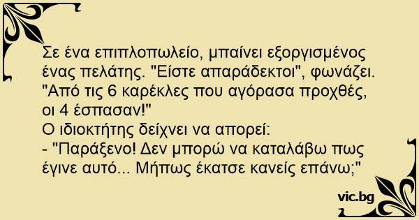 Σε ένα επιπλοπωλείο, μπαίνει εξοργισμένος ένας πελάτης. "Είστε απαράδεκτοι", φωνάζει. "Από τις 6 καρέκλες που αγόρασα προχθές, οι 4 έσπασαν!"