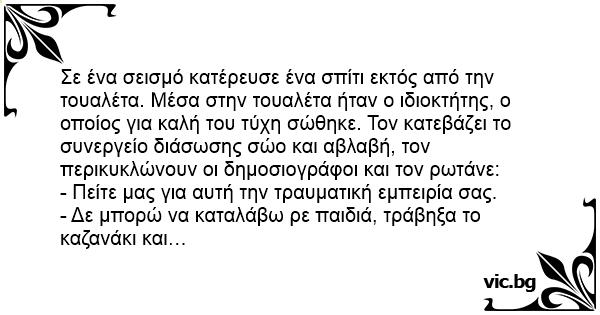 Σε ένα σεισμό κατέρευσε ένα σπίτι εκτός από την τουαλέτα. Μέσα στην τουαλέτα ήταν ο ιδιοκτήτης, ο οποίος για καλή του τύχη σώθηκε. Τον κατεβάζει το συνεργείο διάσωσης σώο και αβλαβή, τον περικυκλώνουν οι δημοσιογράφοι και τον ρωτάνε: