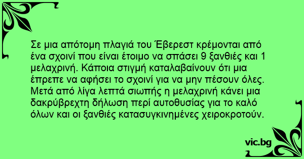 Σε μια απότομη πλαγιά του Έβερεστ κρέμονται από ένα σχοινί που είναι έτοιμο να σπάσει 9 ξανθιές και 1 μελαχρινή. Κάποια στιγμή καταλαβαίνουν ότι μια έπρεπε να αφήσει το σχοινί για να μην πέσουν όλες.