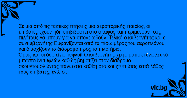 Two blind pilots get on a plane and walk right Through the main aisle, sporting white canes and dark shades. The passengers are mildly concerned but assume it’s all a joke. The plane starts taxiing...