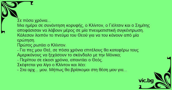 Μια ημέρα σε συνάντηση κορυφής, ο Κλίντον, ο Γιέλτσιν και ο Σημίτης αποφάσισαν να λάβουν μέρος σε μία πνευματιστική συγκέντρωση. Κάλεσαν λοιπόν το πνεύμα του Θεού για να του κάνουν από μία ερώτηση.