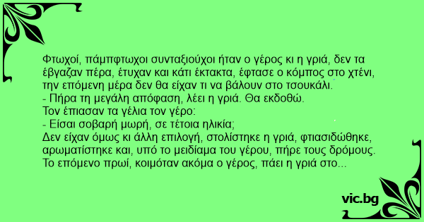 Φτωχοί, πάμπφτωχοι συνταξιούχοι ήταν ο γέρος κι η γριά, δεν τα έβγαζαν πέρα, έτυχαν και κάτι έκτακτα, έφτασε ο κόμπος στο χτένι, την επόμενη μέρα δεν θα είχαν τι να βάλουν στο τσουκάλι.
