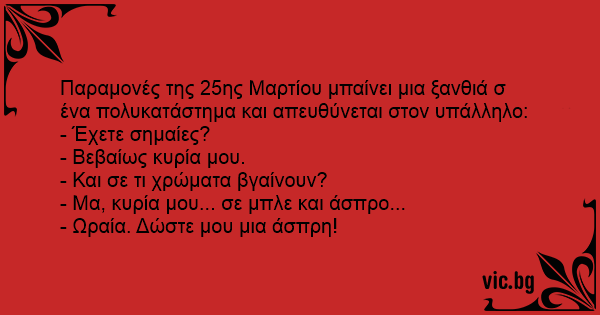 Παραμονές της 25ης Μαρτίου μπαίνει μια ξανθιά σ ένα πολυκατάστημα και απευθύνεται στον υπάλληλο: