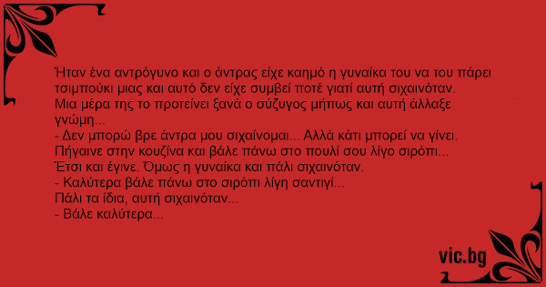 - Δεν μπορώ βρε άντρα μου σιχαίνομαι... Αλλά κάτι μπορεί να γίνει. Πήγαινε στην κουζίνα και βάλε πάνω στο πουλί σου λίγο σιρόπι...