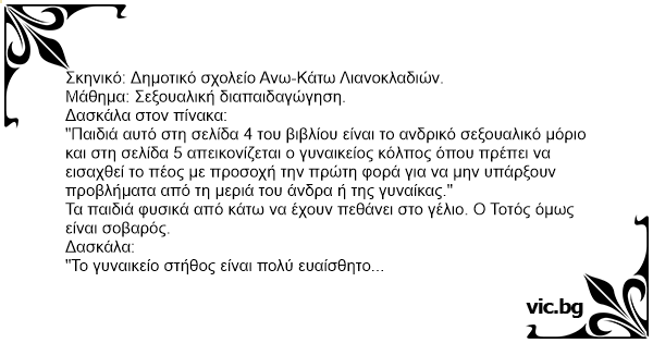 "Παιδιά αυτό στη σελίδα 4 του βιβλίου είναι το ανδρικό σεξουαλικό μόριο και στη σελίδα 5 απεικονίζεται ο γυναικείος κόλπος όπου πρέπει να εισαχθεί το πέος με προσοχή την πρώτη φορά για να μην υπάρξουν προβλήματα από τη μεριά του άνδρα ή της γυναίκας."