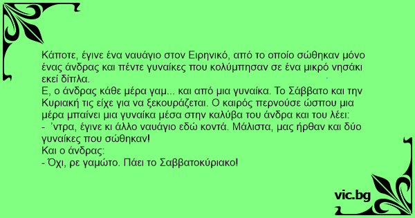 Ε, ο άνδρας κάθε μέρα γαμ... και από μια γυναίκα. Το Σάββατο και την Κυριακή τις είχε για να ξεκουράζεται. Ο καιρός περνούσε ώσπου μια μέρα μπαίνει μια γυναίκα μέσα στην καλύβα του άνδρα και του λέει: